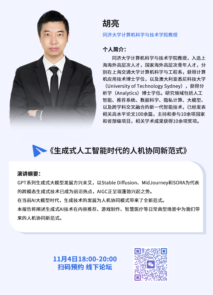 主题分享环节,同济大学计算机科学与技术学院胡亮教授将围绕“生成式人工智能时代的人机协同新范式”主题展开分享,从“技术本质”到“场景落地”,为大家拆解核心,吃透技术逻辑,掌握落地框架。