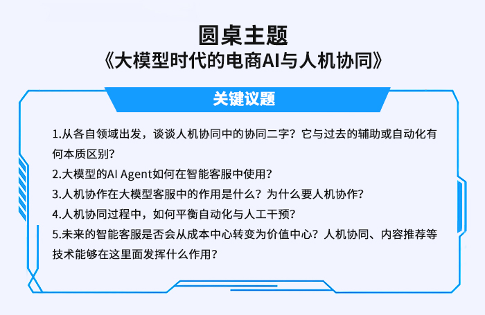 圆桌讨论环节,论坛特别组建“技术权威+电商实战派+学术专家”多元嘉宾团,围绕《大模型时代的电商 AI 与人机协同》 主题,直面电商人最关心的5大核心痛点,展开深度对话与经验共享。